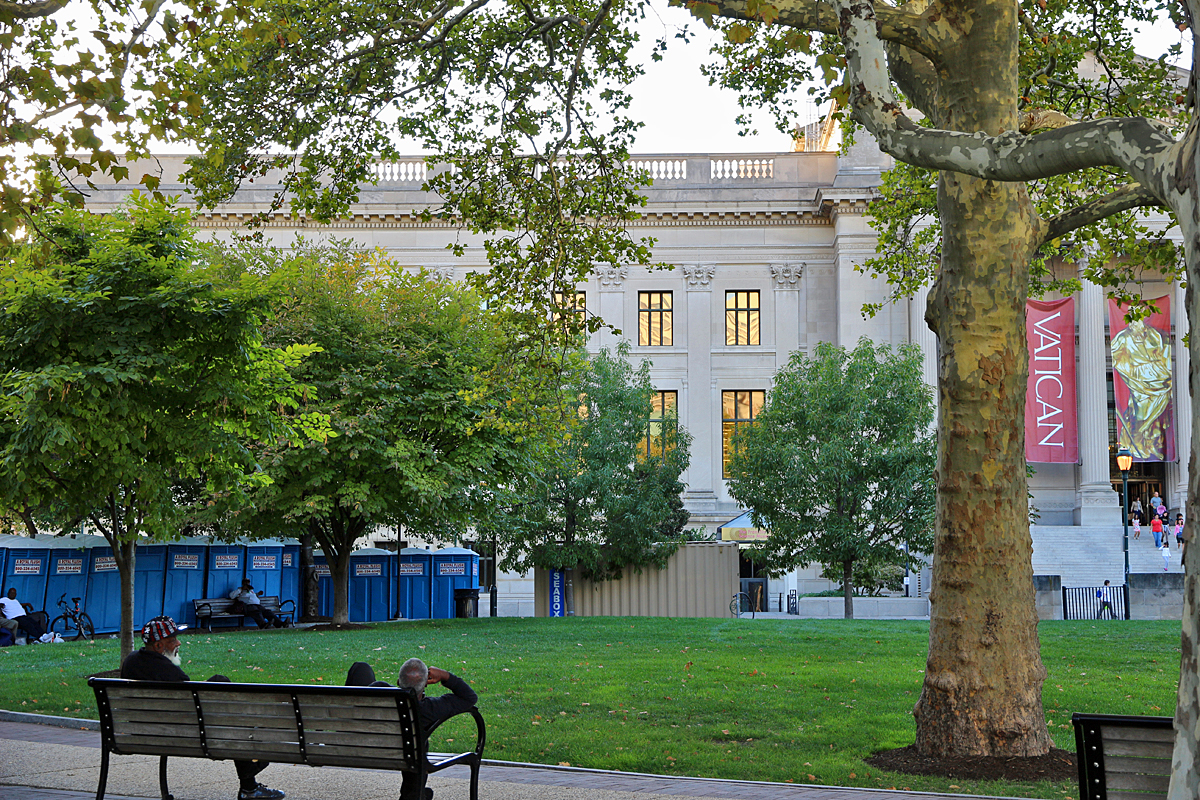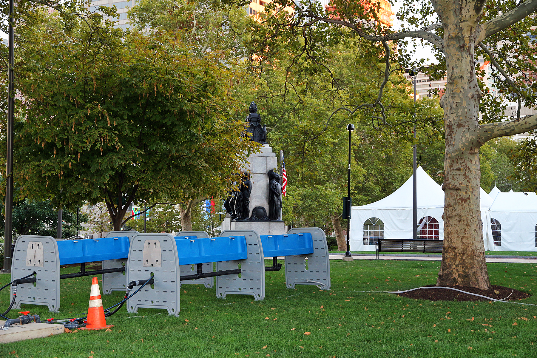 So what was there to see between city hall and the art museum? A solid mile of metal barriers…hundreds of identical food tents, with soda already in the refrigerator cases…walls of WaWa water pallets (they reportedly donated 1,000,000 bottles)…piles of folding tables and chairs…40 Jumbotron supports…metal scaffolding with rough wooden shacks on top (for press studios, among other things)…smiling out-of-town pilgrims with World Meeting tags around their necks and clear plastic backpacks…Philadelphia mounted police (I haven’t seen those since I moved away in the ’70s)…a reported 3,000 port-a-potties (apologies to people hosting events anywhere else on the continent this week)…strangely undersized cardboard trash and recycling cans…banks of portable urinals (barely, as it were, hidden behind portable screens)…and rows of plastic sinks…