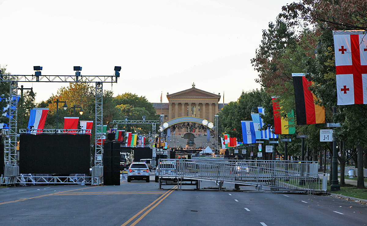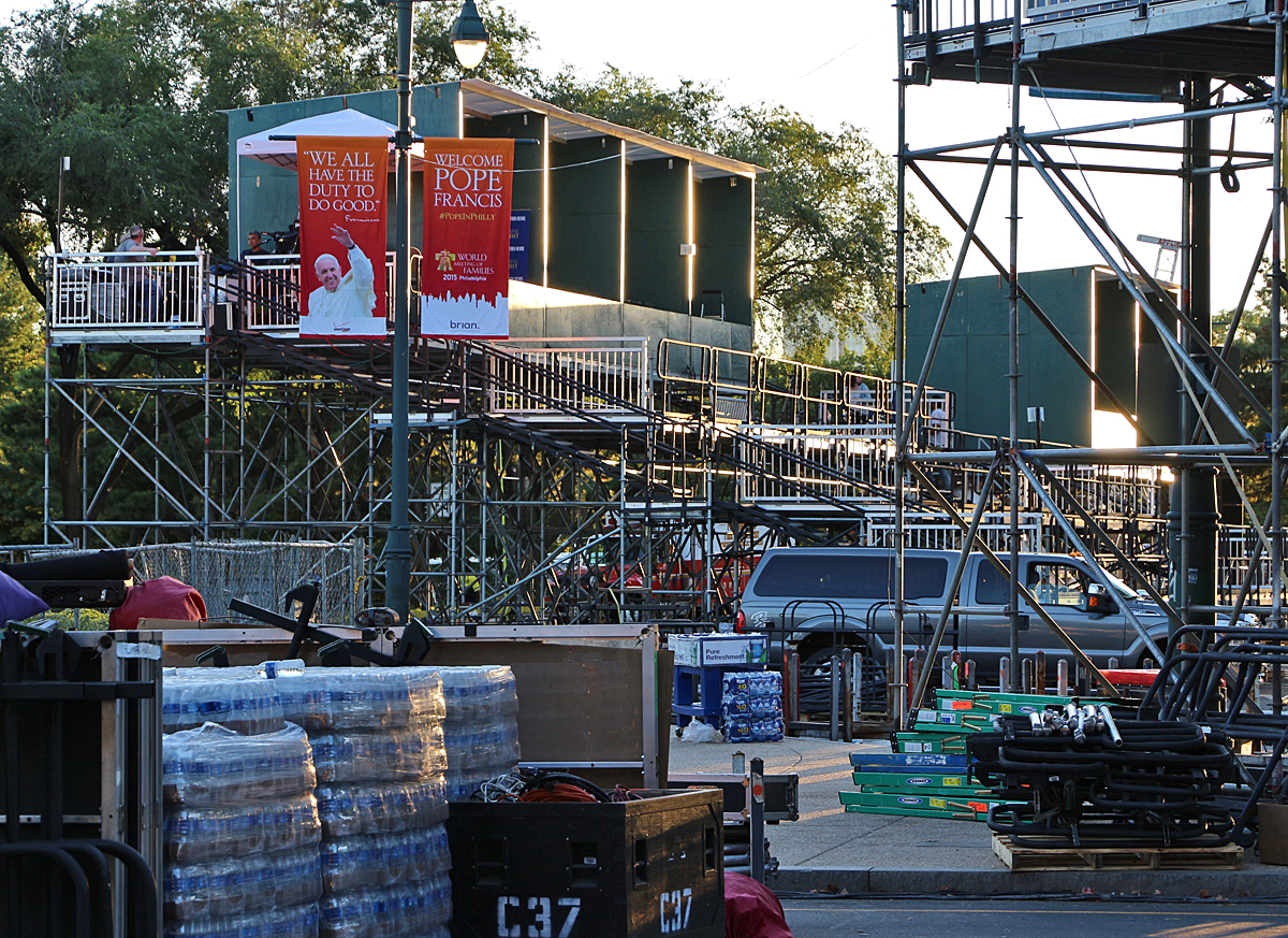 But before our Broad Street Subway entrance closes — and the security checkpoints click in around the “Secure Event Perimeter” (aka the “Pope Francis Festival Grounds”) — we headed to the Parkway on Wednesday evening to check out the preparations…