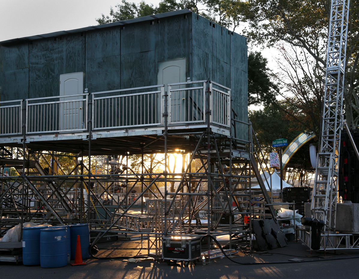 (A look at the scaffolding and the unlovely sheds that will serve as media headquarters. And, yes, you can see some of the 1,000,000 water bottles donated by WaWa in front.