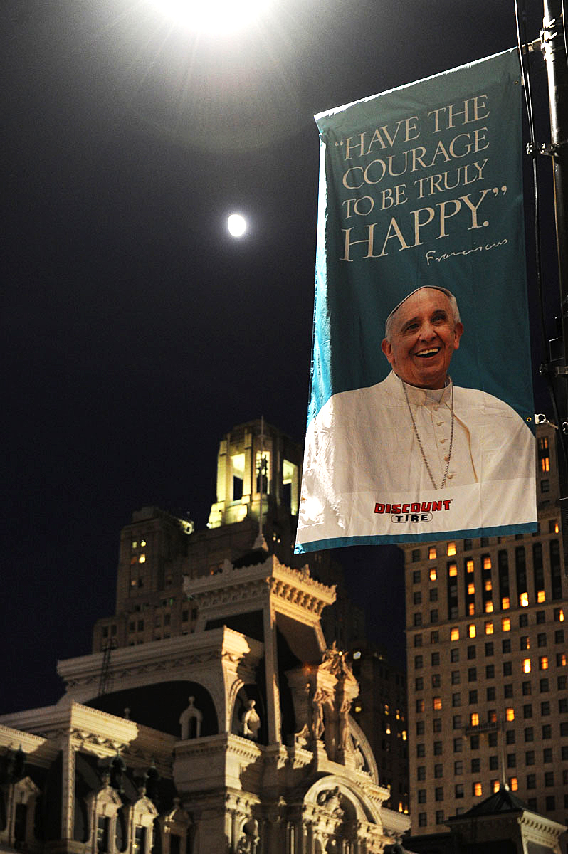 Heading to the subway, Dave caught the perfect summary photo: The moon, a street light, city hall, the PNB building, an inspirational banner of the Pope sponsored by Discount Tire. What more could you want?