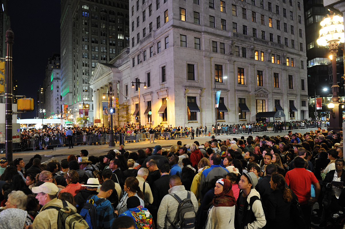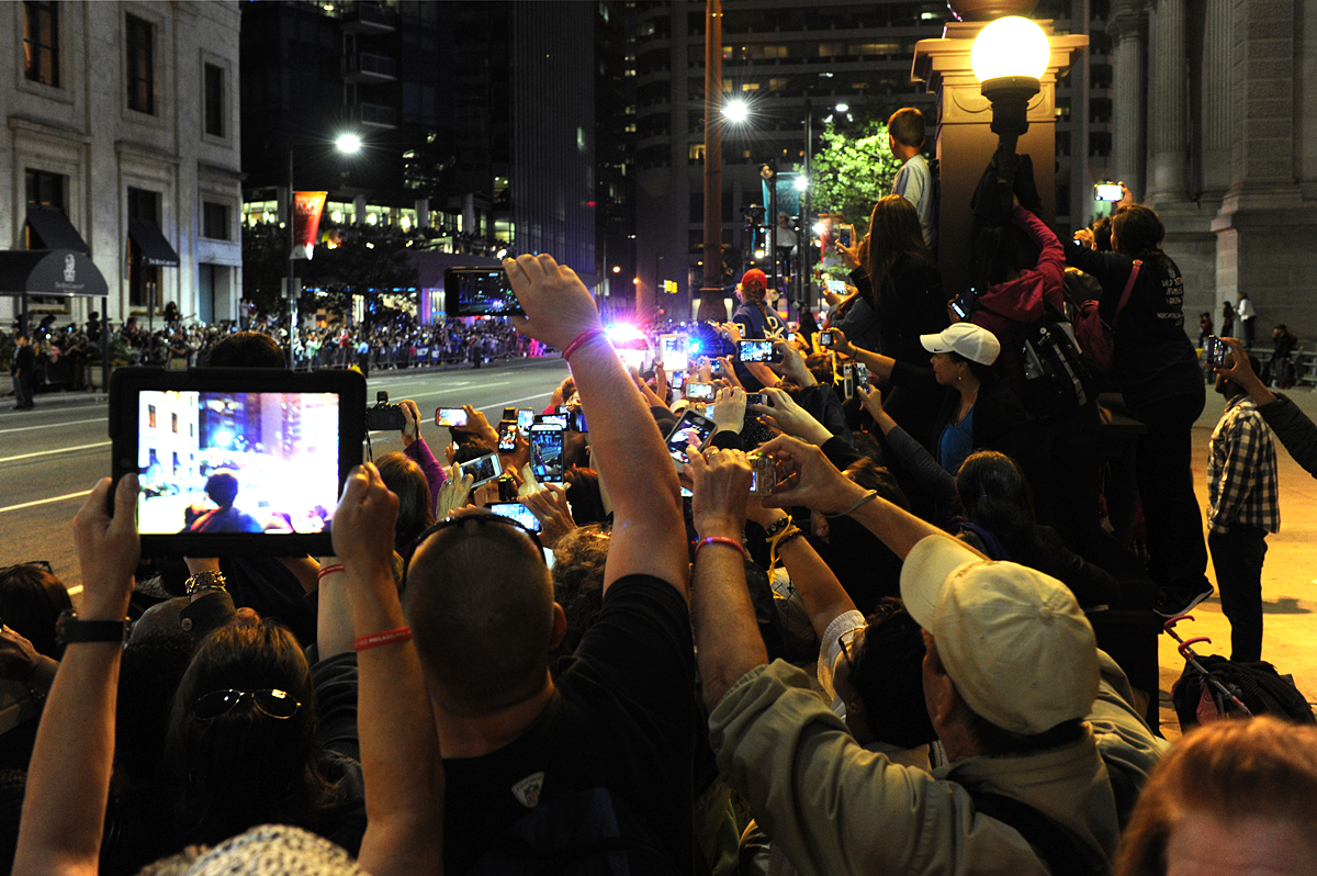 Our trekking goal? The south side of City Hall, the farthest point in the Saturday night Popemobile parade from the Eakins Oval stage and back – and our best shot to see him all weekend. By 5 pm, we were standing in the Broad Street security line. By 5:30, they announced that no more people would be admitted.