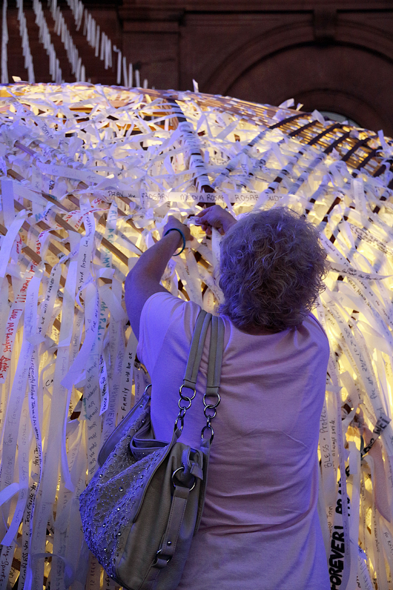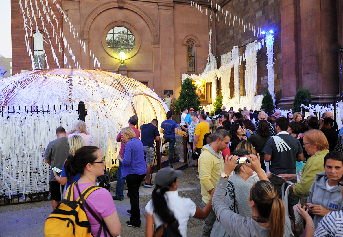 Open until October 4, Saligman’s grotto – made in honor of Pope Francis’ visit – is a round, 20-foot wide cedar framework nestled beside Philadelphia’s cathedral. Visitors write their personal struggles on a strip of cloth, which they then knot to the grotto frame…